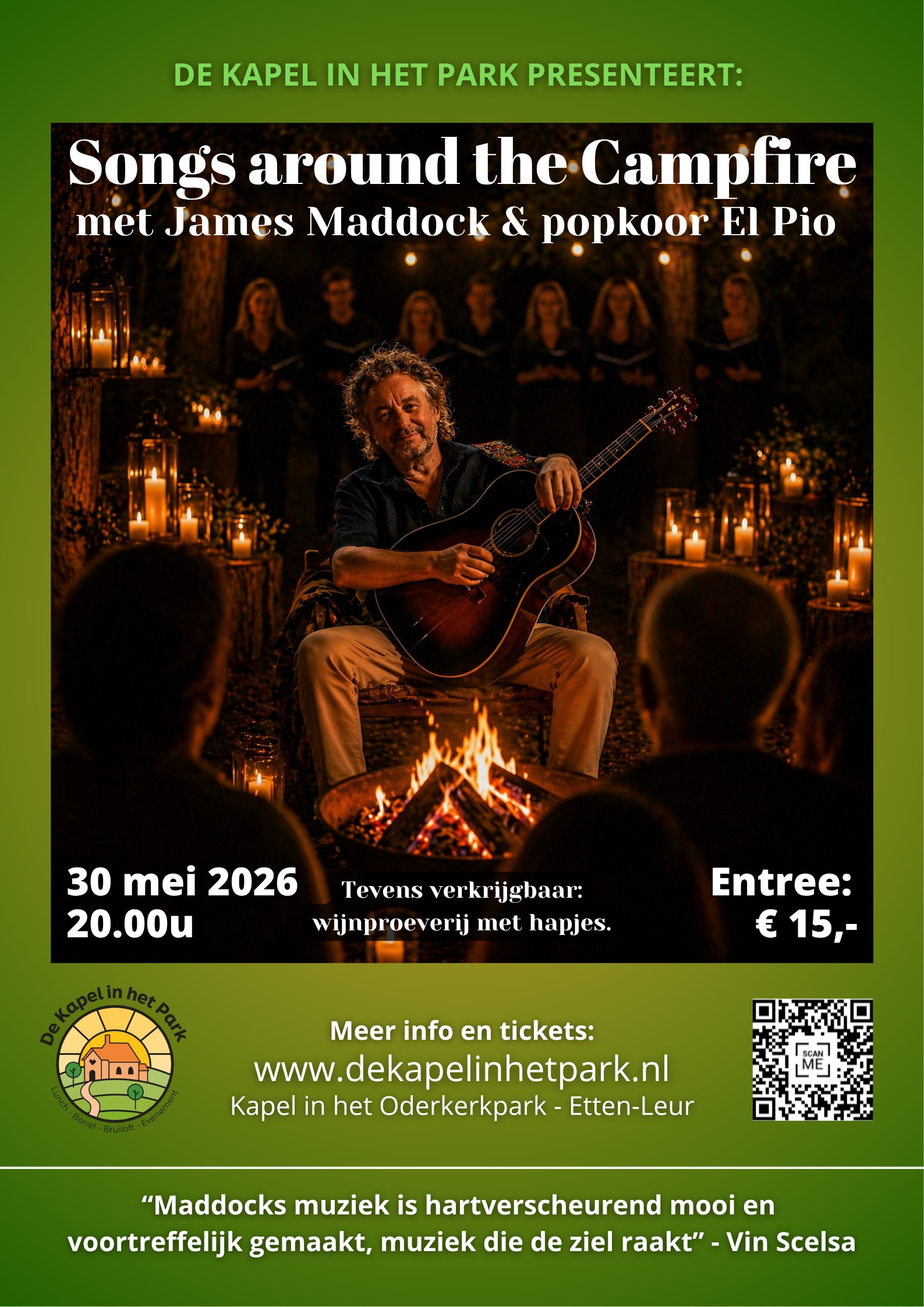 Op 30 mei 2026 staat de veelgeprezen Britse singer-songwriter James Maddock samen met popkoor El Pio in de Kapel in het Park – een unieke, sfeervolle locatie.